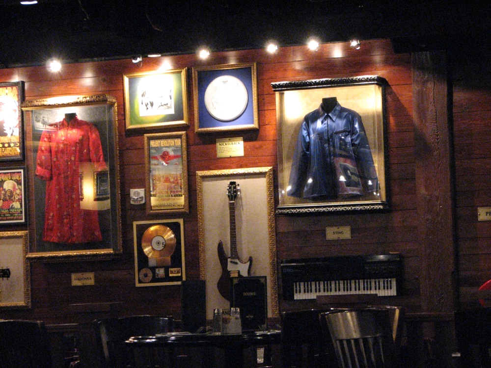 ハード・ロック・カフェ/Hard Rock Cafeの店内にはミュージシャンにちなんだ楽器や衣装がいろいろ展示したります。