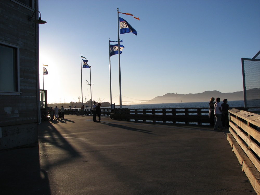 遠くには靄がかかった対岸が見えます。はっきりと見えるアルカトラズ島には夕日が当たってました。